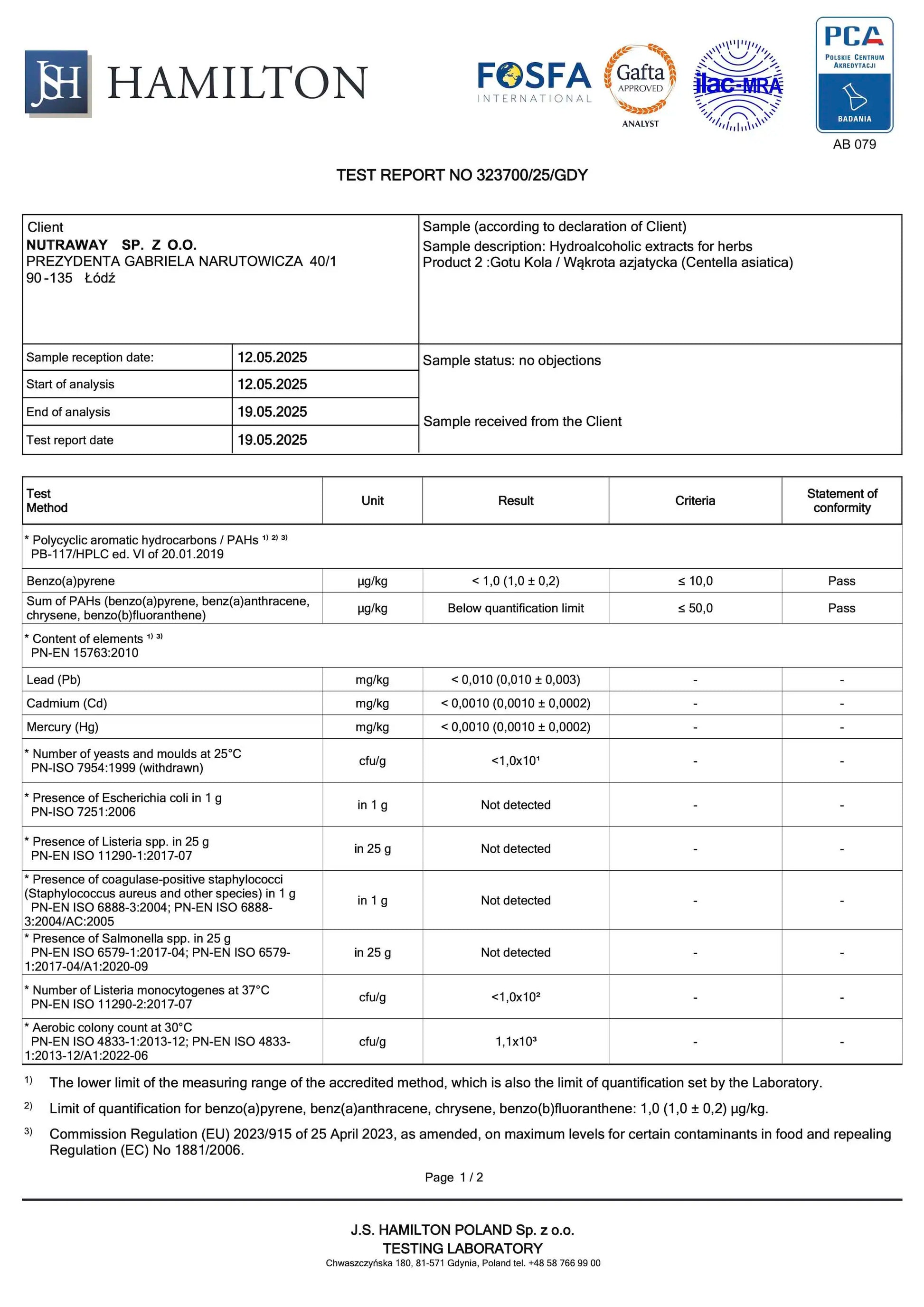 Ricerca condotta da J.S. Hamilton Poland Sp. z o.o. per conto di Nutraway Sp. z o.o., proprietaria del marchio privato Ollywell. Sono stati testati campioni di estratto liquido di Gotu Kola. Lo studio è stato condotto secondo un metodo accreditato e i risultati si applicano solo ai campioni ricevuti. Tutti i risultati presentati nel rapporto sono al di sotto dei livelli massimi consentiti di contaminanti specificati nel Regolamento della Commissione (CE) n. 1881/2006 del 19 dicembre 2006. Ciò significa che l'estratto liquido di Centella asiatica è sicuro per il consumo.