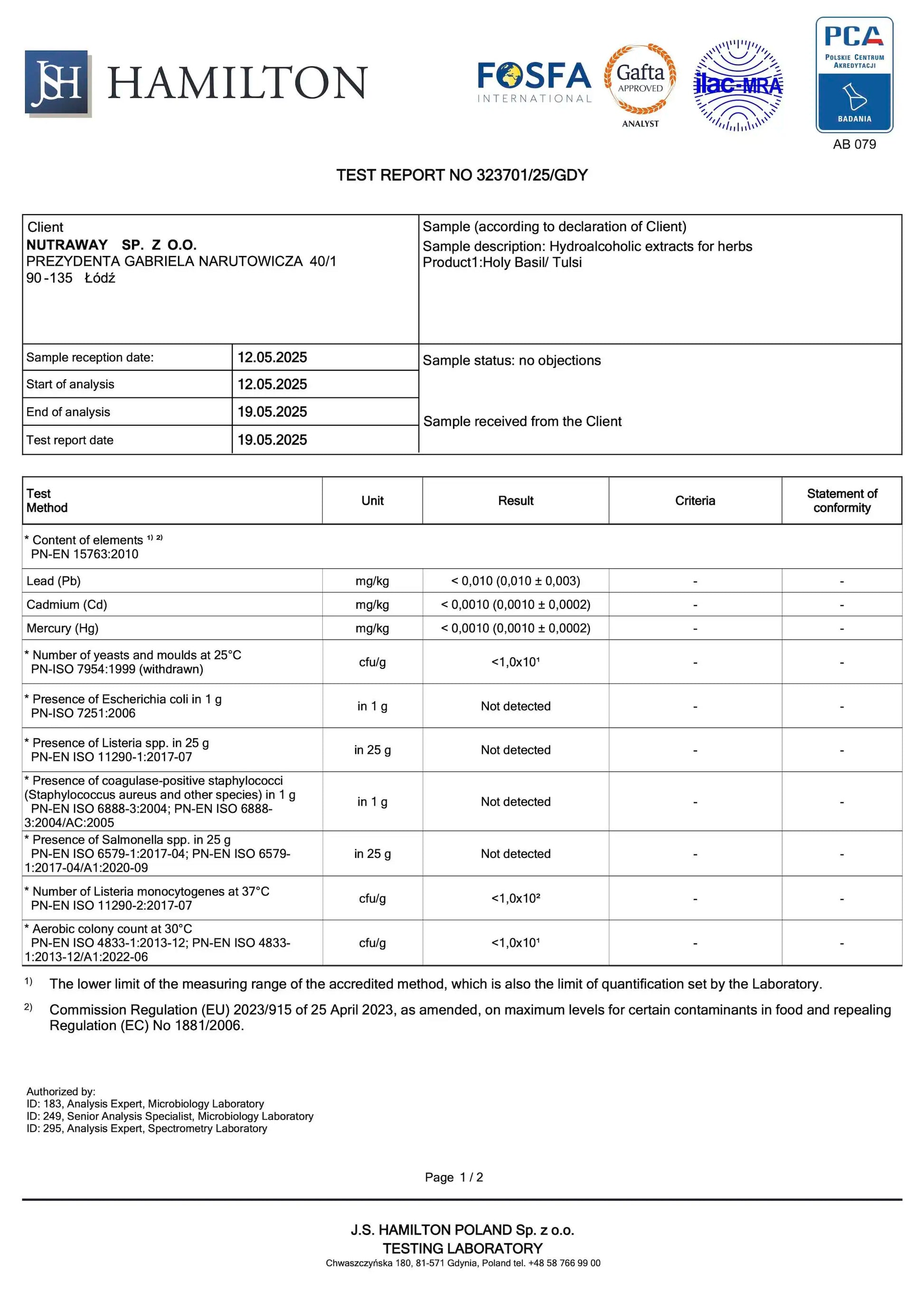 Studio condotto da J.S. Hamilton Poland Sp. z o.o. per conto di Nutraway Sp. z o.o.—il proprietario del marchio a marchio privato Ollywell. Sono stati testati campioni dell'estratto liquido di Basilico Sacro. L'analisi è stata effettuata in conformità a un metodo accreditato, e i risultati si applicano esclusivamente ai campioni ricevuti. Tutti i valori riportati sono al di sotto dei livelli massimi consentiti di contaminanti stabiliti dal Regolamento della Commissione (CE) n. 1881/2006 del 19 dicembre 2006. Ciò conferma che l'estratto liquido di Basilico Sacro è sicuro per il consumo.